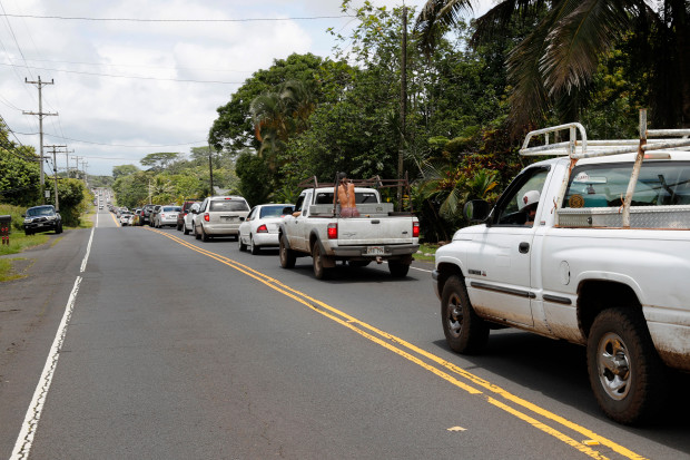 A line of traffic is seen going towards Pahoa town, Sunday, May 6, 2018, near Pahoa, Hawaii. Scientists reported lava spewing more than 200 feet (61 meters) into the air in Hawaii’s recent Kilauea volcanic eruption, and some of the more than 1,700 people who evacuated prepared for the possibility they may not return for quite some time. (AP Photo/Marco Garcia)