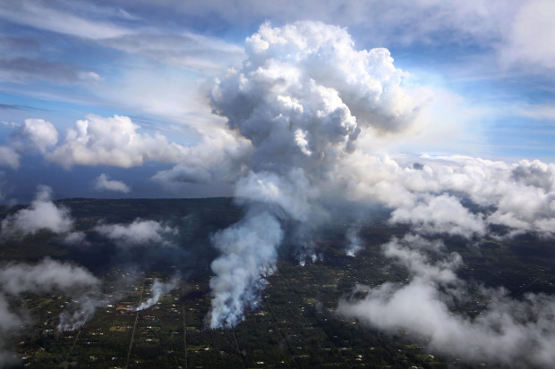 A plume of volcanic gas mixed with smoke from fires caused by lava rises (C) amidst clouds in the Leilani Estates neighborhood in the aftermath of eruptions from the Kilauea volcano on Hawaii’s Big Island on May 6, 2018 in Pahoa, Hawaii. A magnitude 6.9 earthquake struck the island May 4. The volcano has spewed lava and high levels of sulfur dioxide gas into communities, leading officials to order 1,700 to evacuate. Officials have confirmed 26 homes have now been destroyed by lava in Leilani Estates. (Photo by Mario Tama/Getty Images)
