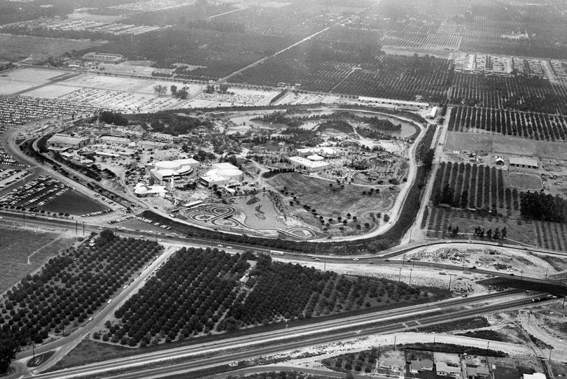 July 17, 1955: Disneyland opening aerial. In foreground is the still-unfinished Santa Ana Freeway. The Harbor Blvd. intersection is on extreme right.