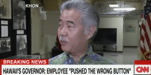 Governor Ige and Mayor Caldwell took center stage to speak on live television to explain their mishap with the Civil Defensive alert that reached 1.43 million people and sent the entire islands into a panic. As Governor Ige Swallowed hard trying to explain what he had to answers to. Wrong Button was pushed. IGE, there is no button. Wrong Alarm was CHOSEN… Then the smug giggles from Ige and Caldwell. Glad they were so comfortable they could giggle at others expense.