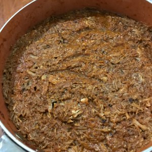 • Open the multi cooker or pot and mix all ingredients together, break the meat down. Pork is broken down and shredded.