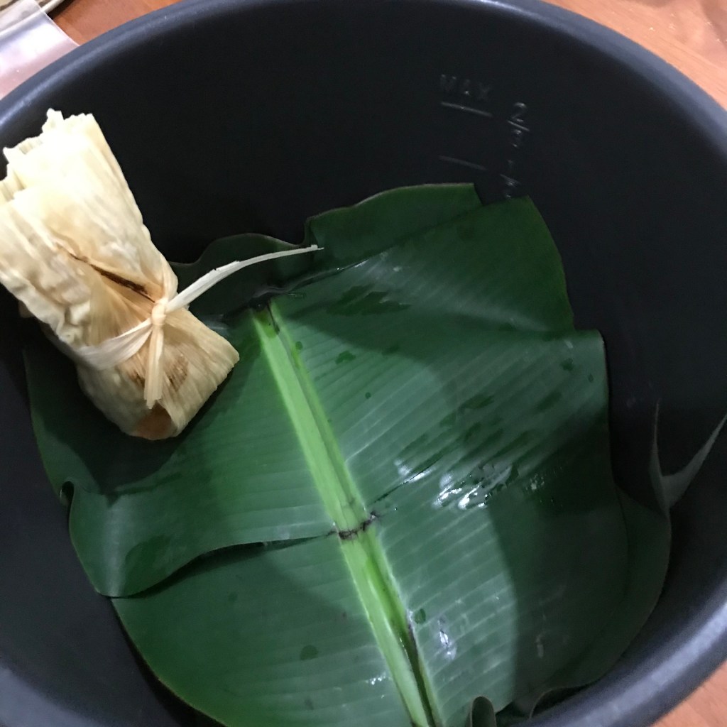 You need to line your pan in this order, #1 water, #2 wire rack and #3 moistened corn husks or banana leaf are last. The water should be right under the rack and not cover the rack or touch the tamales. Less is best and refill when needed. You can put a quarter or spoon in the bottom of the pan so when the water gets low it will sound the alarm so you can add more water. If you need to add water during cooking make sure to pour down the side of the pan so you don’t pour any water on your tamales. Make sure you put the husks or leaf back on top of the tamales. Close the lid and reset your time to finish them.