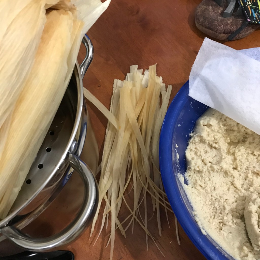 Gather all your ingredients husks, pork, masa and (extra sauce if needed). Make sure to pre-make your ties from smaller husks that wont be used to make the tamales. No waste here.
