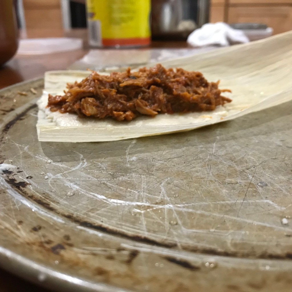 Making the Tamale. Place a corn husk on the plate. Place1 1/2 tablespoon of masa and place baggie or saranwrap over and gently even the dough out. Remove the plastic. Place 1 1/2 tablespoon of meat filling in the center and even it out on the masa. Place one side of the husk over the edge of meat and gently pull the husk away and place the other side of the masa on the edge of other and fold the other husk across and fold the bottom up and tie off. Place it in your pot and your on the way to a delicious meal you have created.